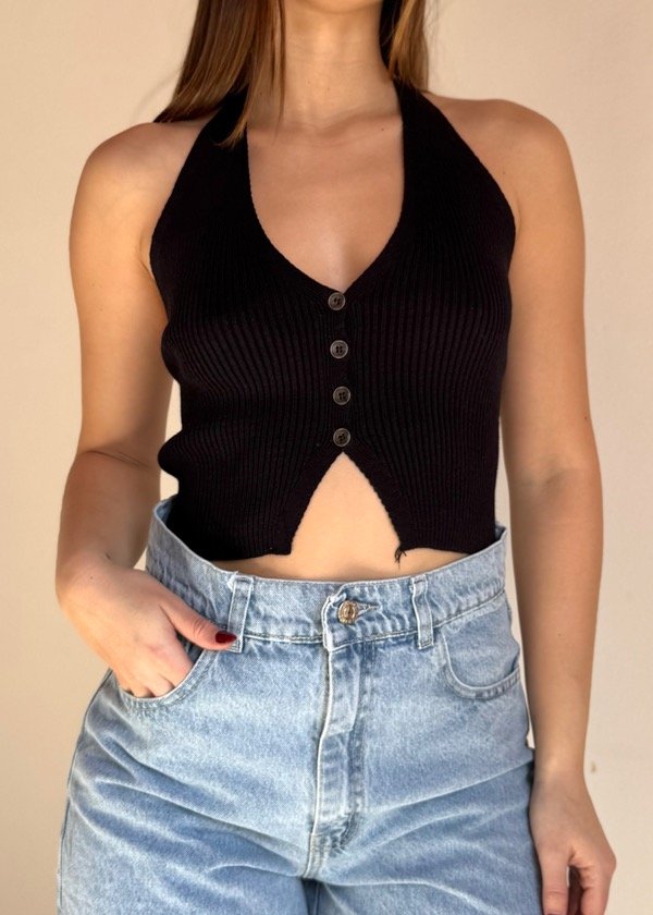 Chaleco hilo de bremer morley, con botones y tira cruzada al cuello. Disponible en talle unico, abarca hasta un TL aprox