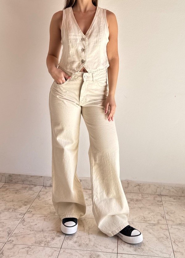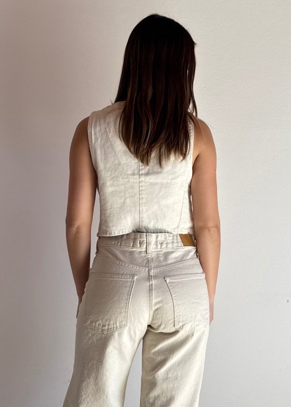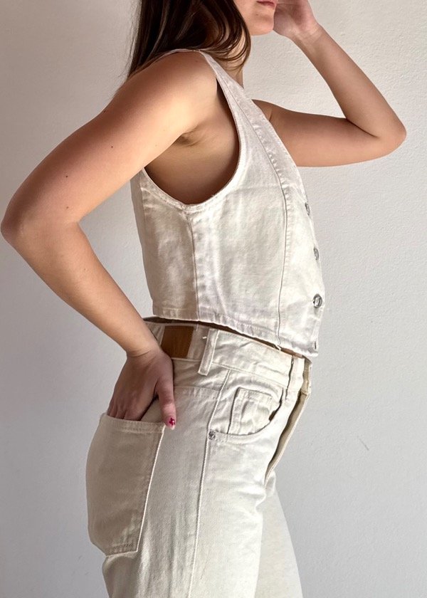 Chaleco corte sastrero, de jeans crudo. Disponible en talle unico, abarca hasta un TL aprox