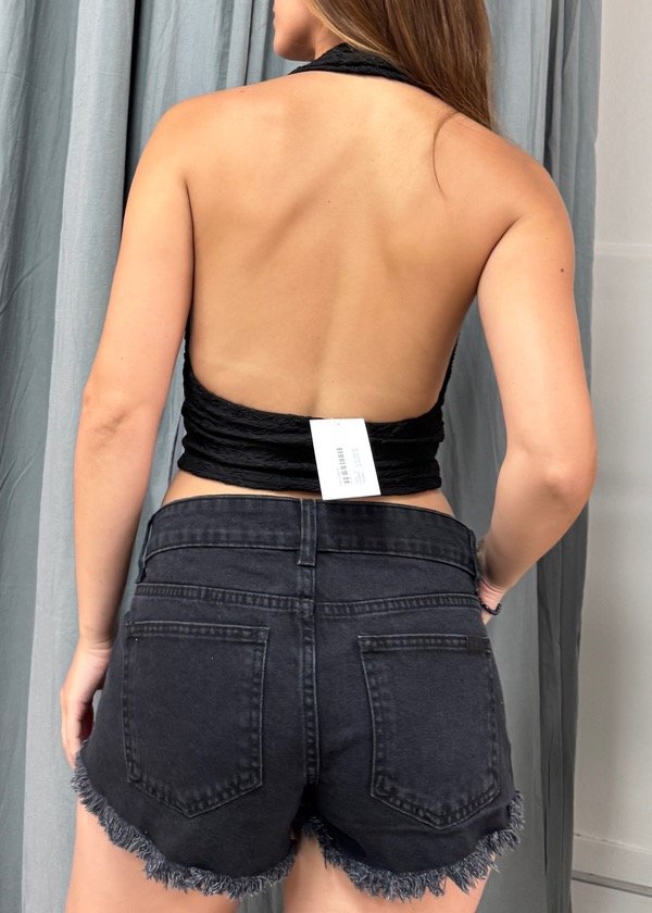 Top de microfibra escote en v, con aplique en busto, para atar en cuello. Disponible en 2 tamaños.