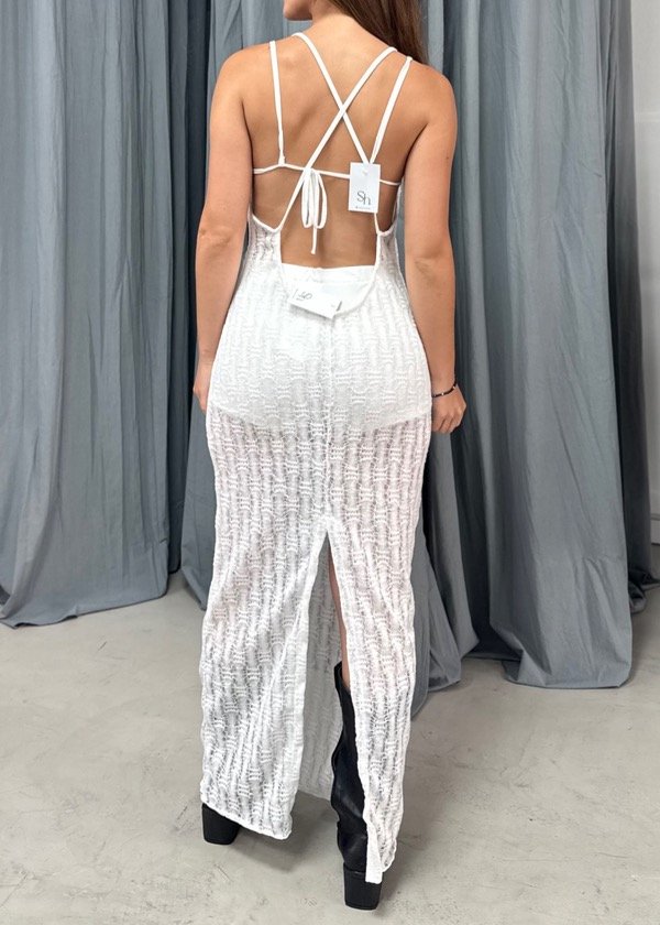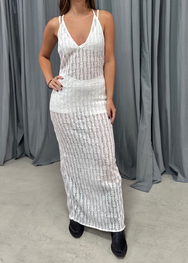 Vestido de tejido, escote en v, con tiras cruzadas en la espalda. Disponible en 3 tamaños.