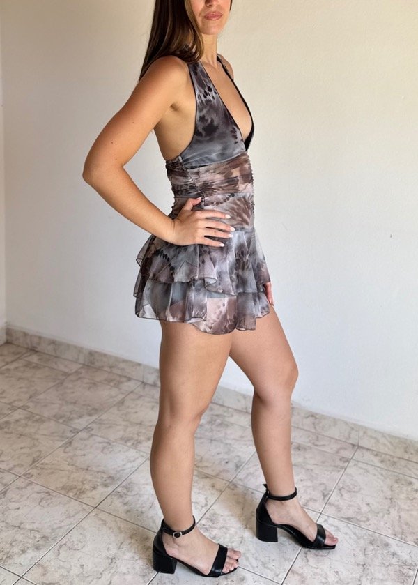 Vestido de tul sublicamo con frunces, con volados y con culotte debajo. Disponible en talle unico abarca hasta un T3 aprox.